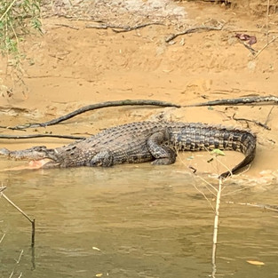 A full day ahead up into Daintree rainforest with Daintree Discovery Tours. We are picked up by our guide for our tour early in the morning and drive north pass the sugar cane fields, where we see the cane cutters in action for the first time whilst in Australia. We stop off at Mossman Gorge and use an aerial walkway where we spot an unusual lizard that the guide gets all excited about. Then it's off to the river and a boat ride along the Daintree River, searching for crocodiles. And crocodiles we do see, mainly basking on the sandy shore in the morning sun, paying no attention to us at all. We then head up towards Cape Tribulation, so named by Captain Cook in 1770 after his ship ran aground because "here begun all our troubles". We walk through a tropical forest to reach a wide, curving sandy beach - Captain Cook really missed appreciating the beauty of theb each back then! Then we re-enter the rainforest, and Alex spots a massive python, curled on a branch about 50 feet up a tree. At lunchtime, we get out at a private spot deep in the rainforest at Diwan. Whilst the guide is preparing lunch, we go for a stroll in the forest and suddenly spot the mysterious Cassowary. It is a male and he's making a deep grumbling sound, which we had already been told by the guide was a warning sign usually because there were chicks about. And we do see the small chick, but only just, as its light brown colour meant it blended into the forest background. After this excitement, we head down to Dagmar and after changing vehicle to a 4x4, go down a rough, bouncy track on private land far from any civilisation, until we reach a pool lined with trees and at the far end, a wonderful waterfall, called Cassowary Falls. The only way to get to the falls is to swim over, which is what Keith and Alex do, dodging the fish, eels and turtles that had come over to greet us. Diane decides just to watch and feed the fish and reptiles instead. It was a piece of paradise and we were reluctant to go.